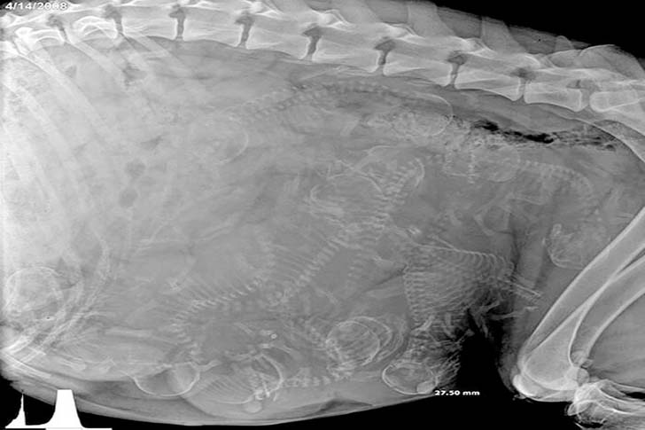 人間の妊娠中の超音波検査は見慣れた光景ですが、妊娠中のワンちゃんののレントゲン写真には驚かされるばかりです。