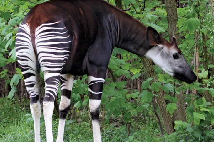 The okapi is a shy forest dweller that looks like a zebra-giraffe hybrid: rich chestnut body, striped white-and-black legs, and a long neck and tongue. Found only in the dense rainforests of the Democratic Republic of Congo, it was unknown to Western science until 1901.