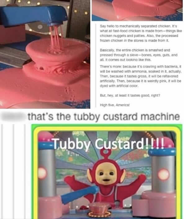 A postagem viralizou e causou muita repulsa até que alguém apontou a verdade. A imagem não era de comida; era uma foto dos bastidores da máquina de “Creme Tubby” do programa infantil Teletubbies.