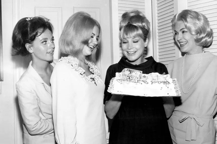 This delightful 1965 photo captures “I Dream of Jeannie” star Barbara Eden celebrating her impending motherhood with fellow actresses Dawn Wells (“Gilligan’s Island”), Shelley Fabares, and Lori Nelson. At the height of her fame as television’s favorite genie, Eden glows with real-life magic as she prepares for her most important role yet – becoming a mother.