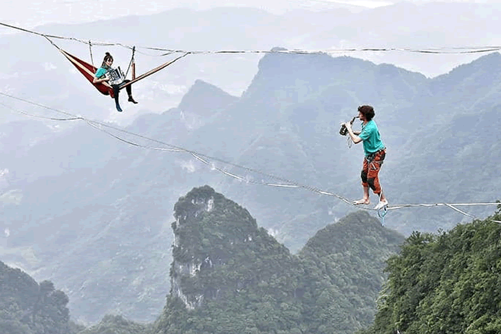 Die Leute, die du auf dem Foto siehst, tragen Gurte, aber selbst damit ist es immer noch furchteinflößend. Also, warum sind sie überhaupt da oben? Diese Personen sind Teil einer slacklinenden Musikgruppe namens Houle Douce, und das Foto stammt aus dem Jahr 2018. Diese beiden haben für eine Luftvorstellung im Zhangjiajie National Forest Park in der Provinz Hunan, China, geprobt. In 1400 Metern über dem Meeresspiegel haben die beiden Mut und Talent bewiesen, während die Welt zusah. Ohne Zweifel verdienen diese beiden Anerkennung für ihre Arbeit.