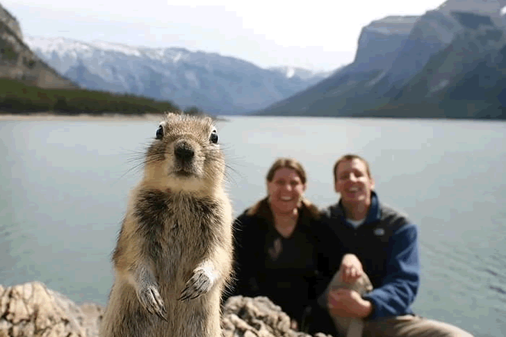 Auf diesem Foto, das mittlerweile den Namen “Crasher Eichhörnchen” trägt, entschied sich ein Eichhörnchen, das Bild von Mellissa und Jackson Brandts zu stören, als sie ihren Urlaub am Lake Minnewanka verbrachten. Statt des Paares mit dem See im Hintergrund steht jetzt das Eichhörnchen im Mittelpunkt. Sogar National Geographic fand das amüsant und veröffentlichte das Foto 2009 auf ihrer Website. Was meinst du? Wer ist jetzt der Fotobomber auf diesem Bild?