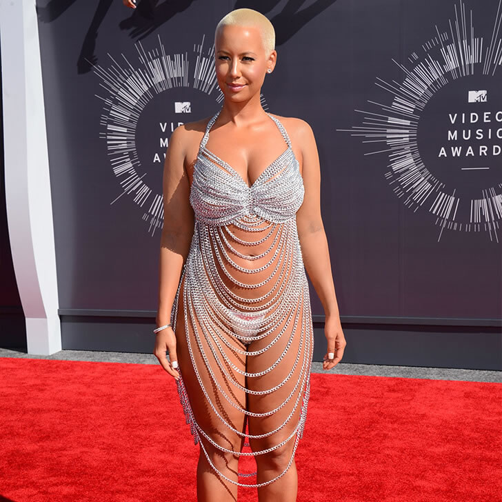 At the 2014 MTV VMAs, Amber Rose set the red carpet ablaze with her daring and unforgettable look. The model and actress turned heads in a show-stopping chainmail gown designed by Laura Dewitt. The metallic dress hugged her curves and left little to the imagination, boldly expressing body positivity and self-confidence.