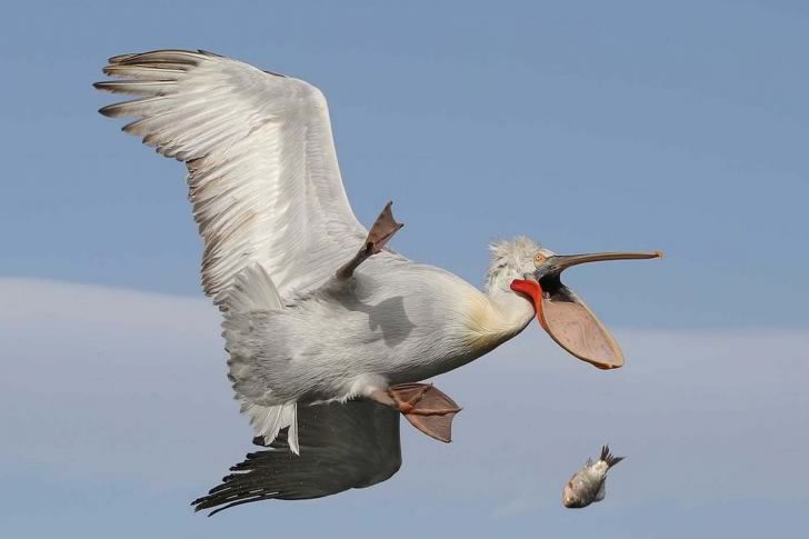 Timing is everything when it comes to wildlife photography, and this photo captures a hilariously unfortunate moment in midair. A pelican, wings fully spread in flight, has just missed its catch — a fish that now tumbles helplessly toward the ground. The expression on the bird’s face, wide-eyed and beak agape, mirrors the exact moment of disbelief as its meal escapes by mere inches. It’s a rare instance where nature, grace, and comedy collide in perfect synchrony.