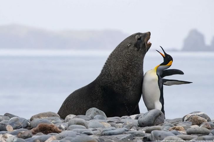 What makes this image particularly amusing is the sheer contrast between the animals. The penguin, with its upright, dignified posture, appears ready to engage in a serious discussion, while the seal, with its more relaxed and forceful demeanor, seems to be all about making itself heard. The unspoken tension between the two animals creates a sense of comedic drama, as if they are involved in some form of heated debate. It’s moments like these that remind us of the unpredictable nature of wildlife, where even the most serene environments can lead to an entertaining encounter.