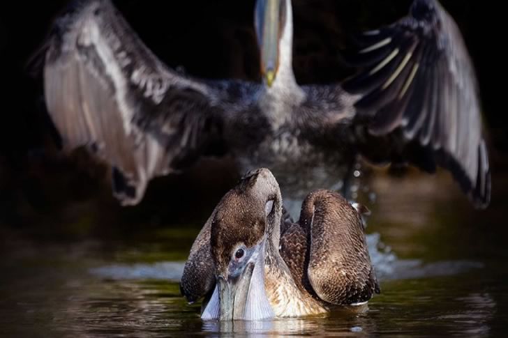 This remarkable moment captures the intensity of birdlife in a dramatic and comical way. In the foreground, a pelican dips its head into the water, its posture focused as it appears to be hunting or foraging. But it’s the background that really steals the show: another pelican, with its wings spread wide, looks as though it’s about to take flight or engage in an aerial show-off. The contrast between the two pelicans—one submerged and calm, the other stretching its wings with force—adds a touch of humor and energy to the scene.
