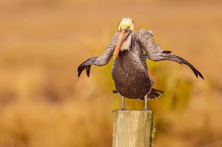 Balancing perfectly on a wooden post, this pelican strikes a pose that can only be described as fabulously awkward. With wings stretched wide, neck twisted, and beak seemingly tangled in its own feathers, the bird looks like it’s mid-dance or caught in a fashion runway mishap. Its expression, if birds could make one, hints at both determination and mild confusion. The golden-hued background adds a warm, almost theatrical stage effect to this hilarious moment.