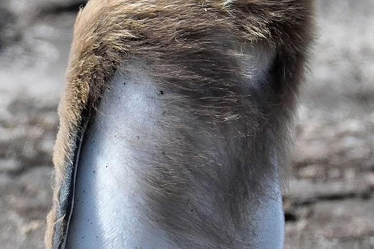 A penguin stands with its back turned, its head tucked under a fluffy mass of feathers, creating a comical disguise that looks like it’s hiding from the world. The gray, rocky ground contrasts with its white and brown plumage, making this awkward pose even funnier, as if it’s playing an amusing game of peekaboo with the camera.