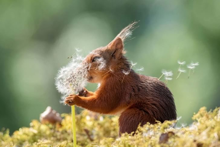 In a moment that feels almost too magical to be real, this squirrel appears to be making a heartfelt wish on a fluffy dandelion. With its tiny paws gently grasping the stem and nose buried in the feathery seeds, it looks like it’s whispering a secret to the wind. The floating seeds caught mid-air add an extra touch of whimsy, making it seem as though nature itself paused for a breath.