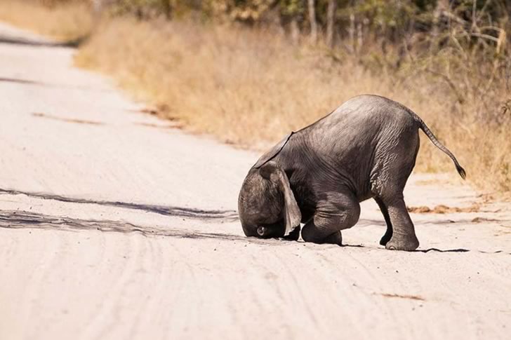 A young elephant wobbles on a sandy path, its head dipped low as if it’s about to take an unexpected tumble. The little one’s awkward stance and wrinkled skin against the dry, grassy surroundings create a hilarious scene, making it look like it’s practicing a clumsy dance move in the wild.