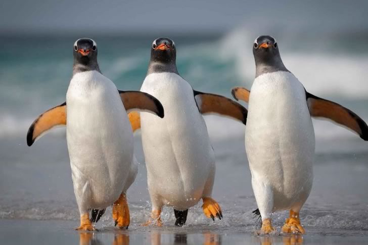 With synchronized steps and flippers confidently outstretched, these three penguins look like they’ve just walked off a movie set. Striding in unison along the shoreline, they give off the vibe of a marching band or a trio of bouncers on a mission. The waves crashing behind them only enhance their dramatic entrance, creating a hilarious and oddly cinematic moment captured perfectly in time.