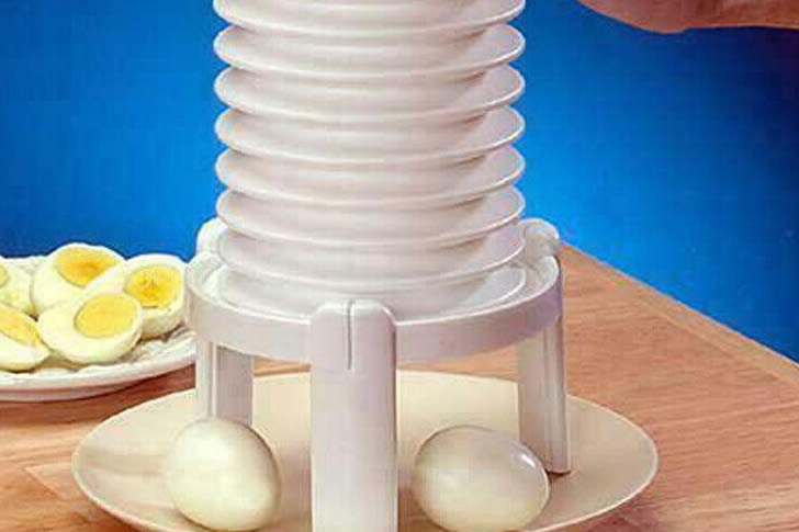 Peeling hard-boiled eggs is a universal annoyance, so the Eggstractor tried to turn frustration into fun. The plastic tower looks like a spring-loaded pogo stick for poultry: place a boiled egg on the rubber spikes, snap the accordion lid down, and—according to the commercial—out pops a perfectly naked egg “ready for salads in seconds.” The infomercial shows chefs giggling as shells fly dramatically across the countertop, as if breakfast prep had suddenly become a carnival game.