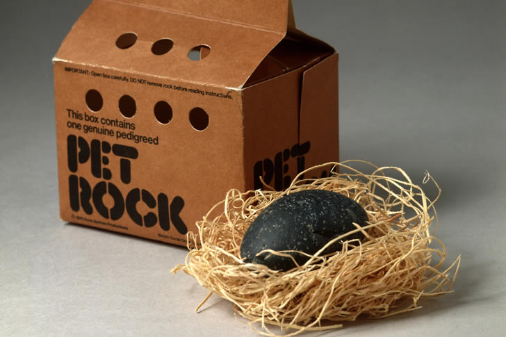In 1975, Gary Dahl convinced the world to buy… rocks. Not fancy crystals, just ordinary grey pebbles from a building supply store, placed in cardboard boxes with air holes and straw bedding. He marketed them as low-maintenance pets, complete with a tongue-in-cheek training manual. The idea struck a bizarre cultural chord and over 1.5 million Pet Rocks were sold.