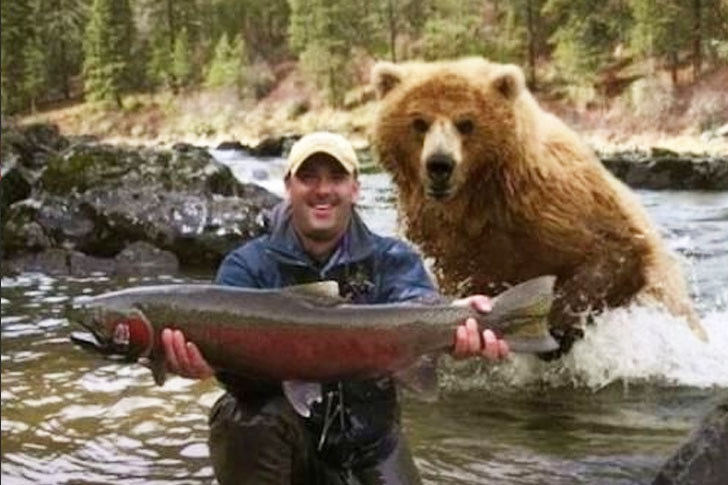 Bears are known to eat either trout or salmon. With this fact, the man certainly isn’t in an excellent position to be celebrating his recent catch. All the guy needs to do is slowly turn and try to offer the fish to the bear. Nonetheless, he deserves credit for an excellent catch, and we wish that the bear went after his catch and not him.