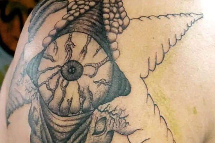 This tattoo blends tribal design with a starfish motif — and the result is a mess of spiky arms and swirling chaos. What should’ve been a symmetrical starfish ends up looking like a sea creature caught in a blender. It’s both fascinating and terrifying at once.
