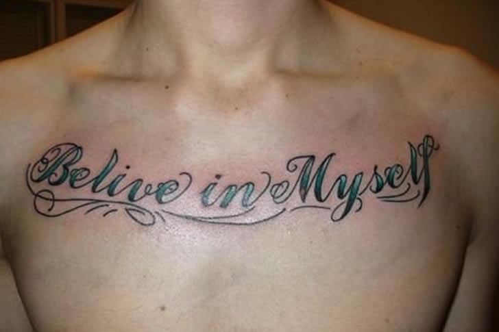 This motivational tattoo was supposed to say “Believe in Yourself,” but the owner got hit by a double whammy of spelling fails. “Believe” loses an ‘e’ and “Yourself” turns into “Yourfelf.” The sparkly cursive with stars makes the errors stand out even more. Instead of an inspiring message, it’s now a permanent source of laughs.