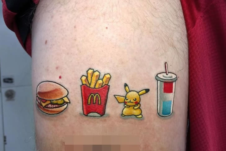 This tattoo enthusiast clearly loves fast food a little too much. The detailed ink shows a McDonald’s meal complete with a burger, fries, and soda. What’s even funnier is that the fries are labeled “freedom sticks” in Comic Sans font, adding an extra layer of goofy charm to this already bizarre tribute.