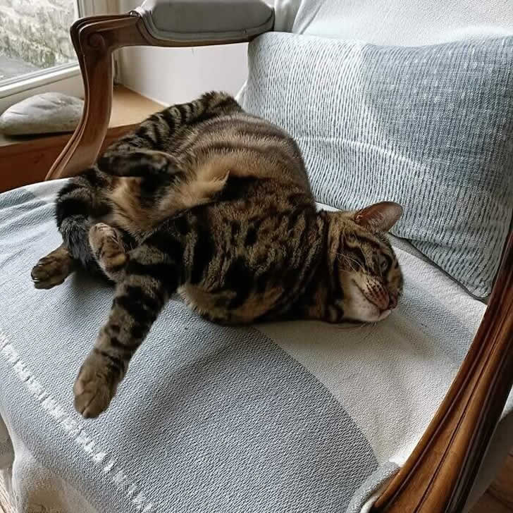 At first glance, it looks oddly content, molded into its chair like it was born for this role. But then you catch the eyes—wide, alert, possibly questioning every life decision that led to this moment. Is it comfortable? Is it stuck? The answer is probably “yes” to both. And while the pose may scream “trapped,” don’t be fooled. One sneeze, one dropped fork, one whisper of a treat bag, and this pretzel will instantly unravel into a fully functioning feline missile.