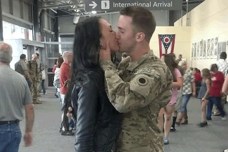 As they hold each other tight, the world around them fades away. We’re glad he made it home safely and that his girlfriend was waiting for him. A sweet welcome home — and we’re happy to have been there, even if only virtually.