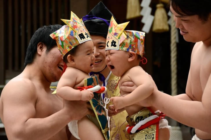 At the Naki Sumo Festival, sumo wrestlers hold babies and try to make them cry. The belief? A crying baby brings good health and wards off evil spirits. The louder the wails, the better. Parents actually want their babies to burst into tears here.