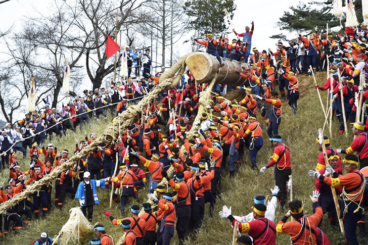 Held every six years in Nagano Prefecture, the Onbashira Festival involves hauling and riding massive 10-ton logs down steep mountainsides. Men literally cling to the logs as they careen downhill, risking serious injury in a centuries-old ritual meant to purify and renew the Suwa Grand Shrine.