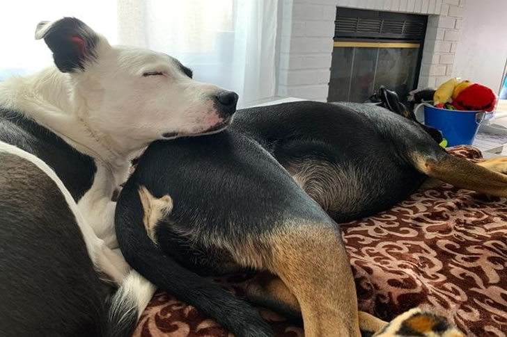 兩隻狗狗,一隻白色,一隻黑色,緊緊地蜷縮在一條有圖案的毯子上,安詳地睡著。溫馨的室內環境,背景有壁爐,為這溫柔的時刻增添了暖意。牠們親密的關係和放鬆的狀態,營造出一幅寧靜而溫馨的畫面。